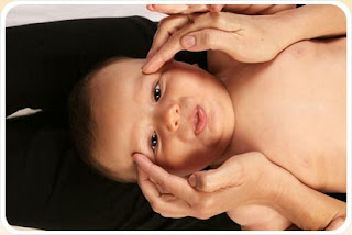 Passo 16 Depois de voltar o bebê para a posição inicial, junte os dedos no centro da testa do bebê e faça um semicírculo, contornando cada olho. Volte para o centro da testa e faça outro semicírculo, indo em direção às maçãs do rosto. Por fim, faça semicírculos, indo até o queixo.