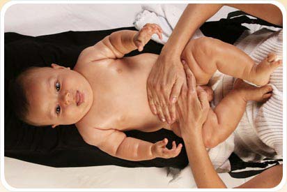 Passo 9 Envolva a perna do bebê com a mão, formando um bracelete, e vá desde a virilha até o tornozelo, alternando as mãos.